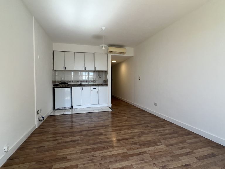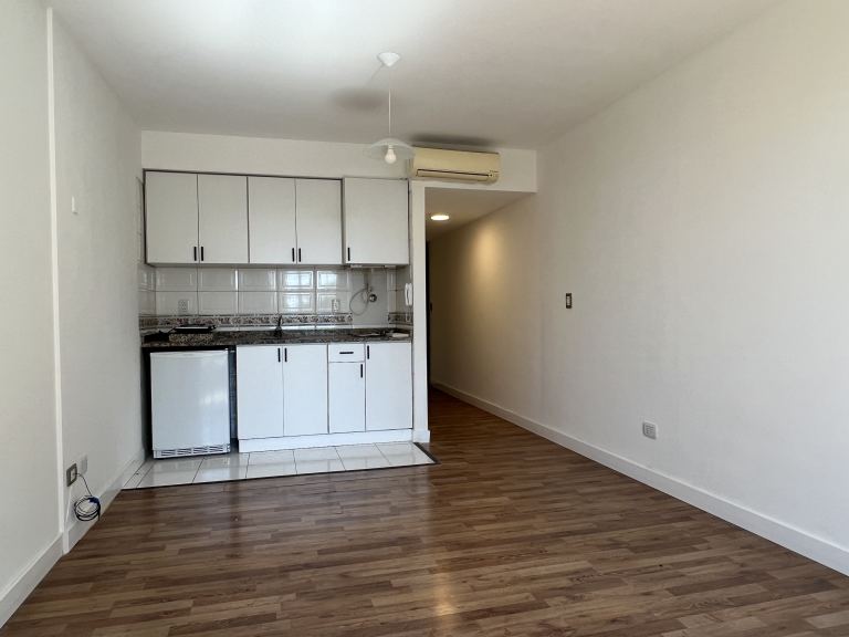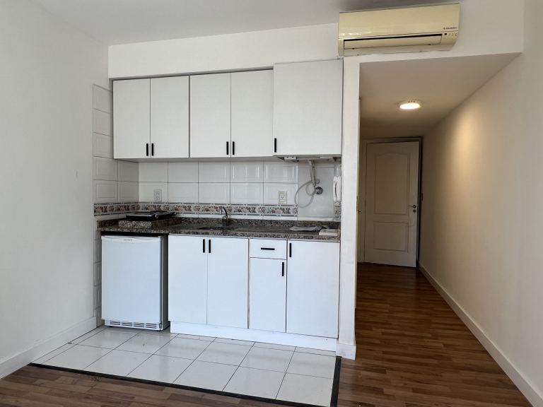 El monoambiente tiene un frigobar, anafe, caldera, pisos en perfecto estado con cortinas, un aire acondicionado, baño completos con placares al ingreso del departamento.